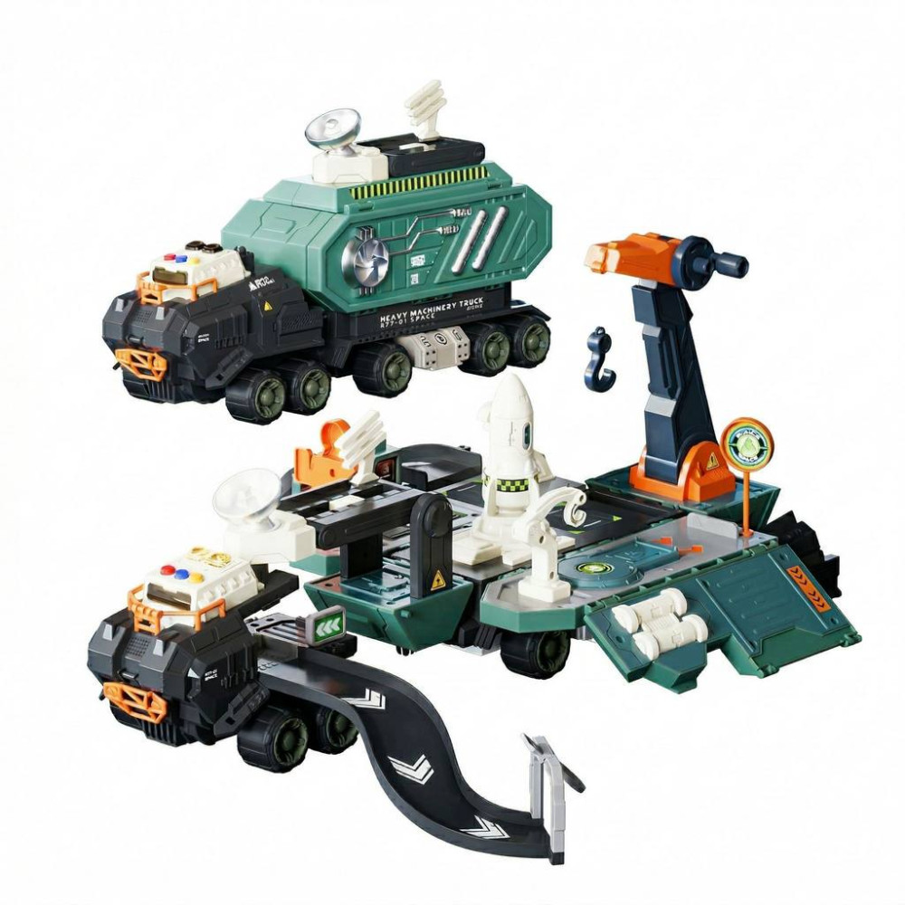 - Design 2 în 1 — un camion mare care se transformă într-o stație spațială funcțională pentru jocuri captivante.