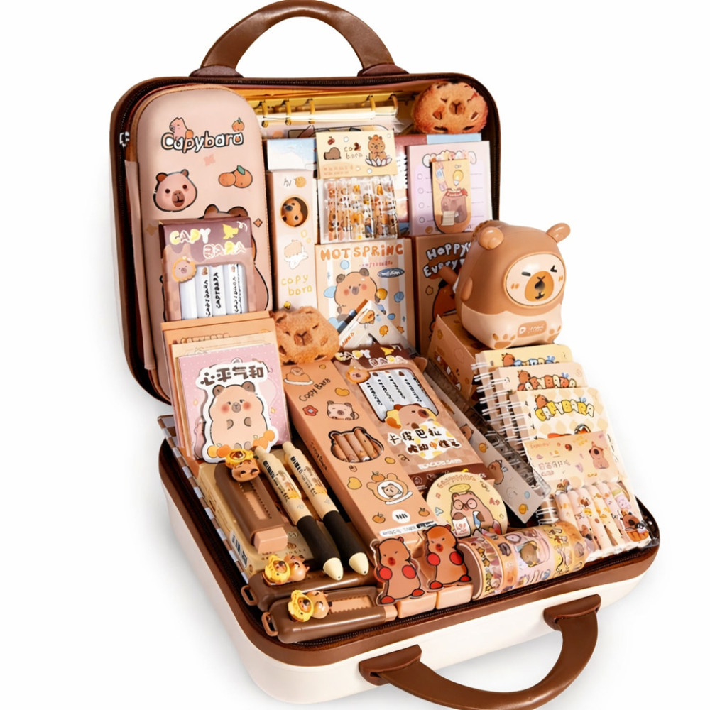 Școala devine o aventură cu Setul de scris Capibara de la Mizi Shop MD! Set complet de papetărie în 55 de piese, prezentat într-o adorabilă valijoară portocalie — tot ce are nevoie un copil creativ.